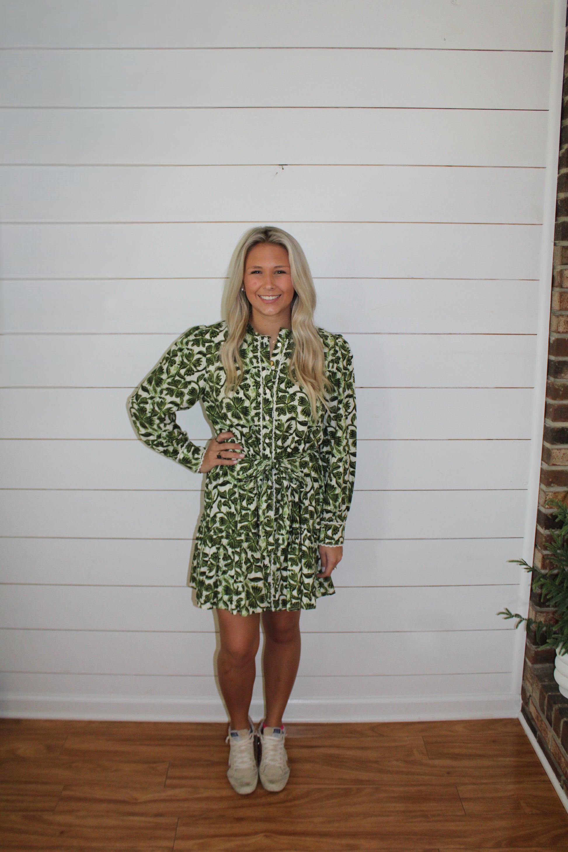 The Holiday Vine Dress. Featuring a stunning green vine print, this dress is the perfect blend of festive charm and everyday elegance. The button-front detail and flattering tiered skirt create a timeless silhouette, while the removable waist tie lets you tailor the fit just the way you like it.