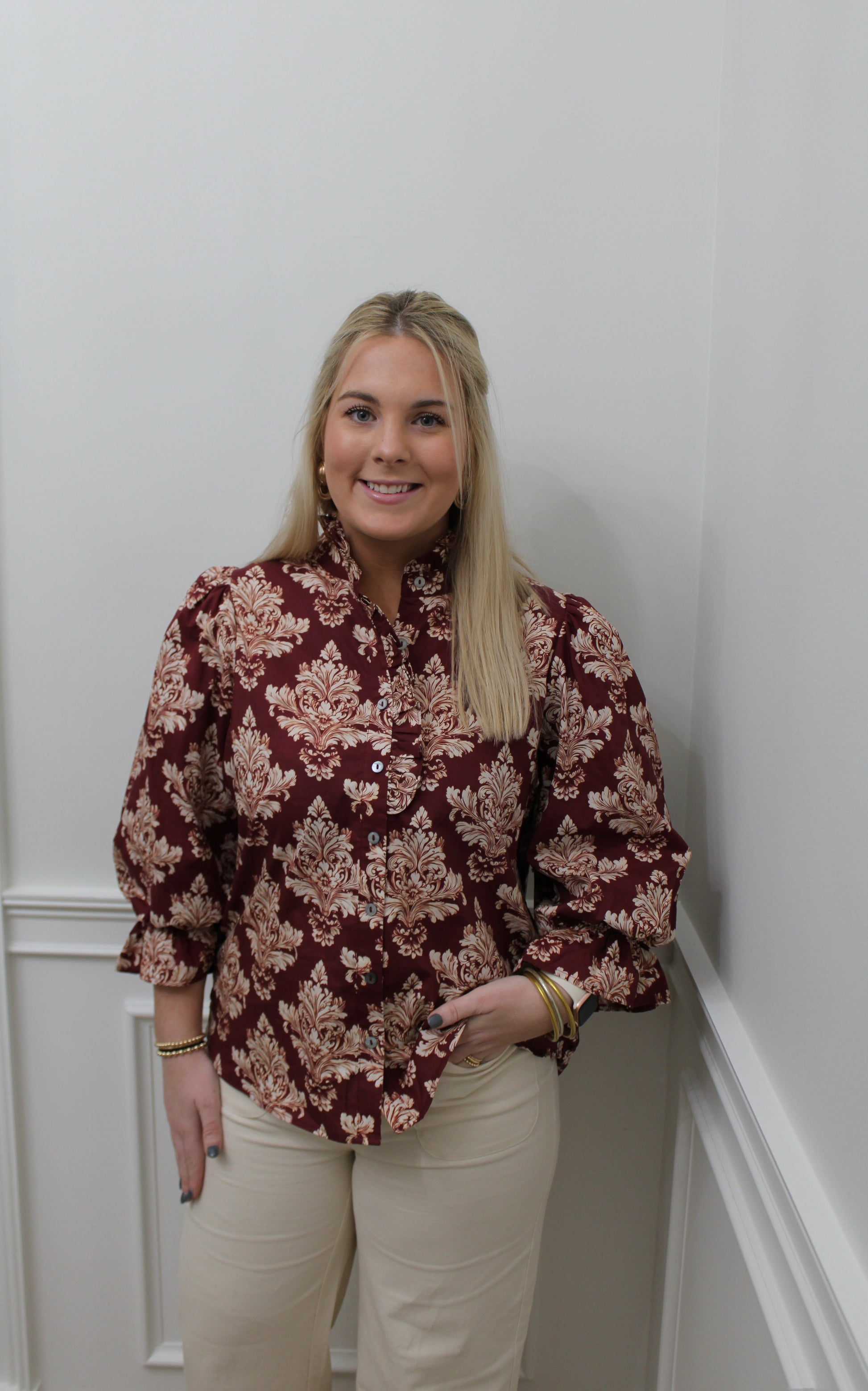 Elegant and effortlessly timeless, The Maroon Garden Blouse features a rich maroon base with a beautiful cream floral print that gives off the perfect touch of Southern charm. The ruffle neckline and puff sleeves add a feminine flair, making it ideal for work, church, or your next fall outing. Pair it with denim or neutral trousers for a classy, put-together look that never goes out of style.