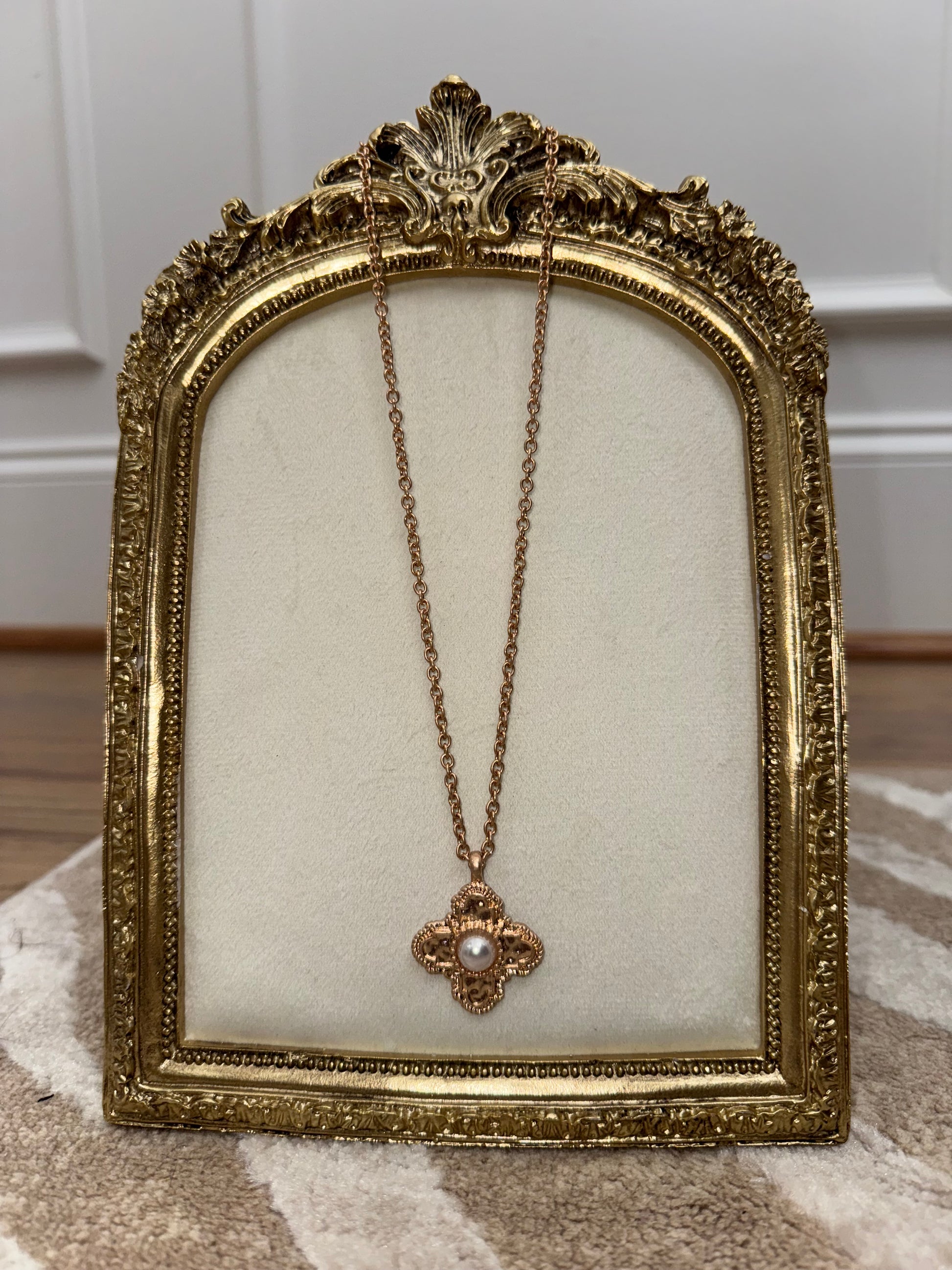 A timeless touch of faith and elegance — the Southern Pearl Cross Necklace is the perfect accessory for any occasion. This gold-toned necklace features a delicate cross-shaped pendant with intricate detailing and a pearl center that adds a soft, feminine charm.