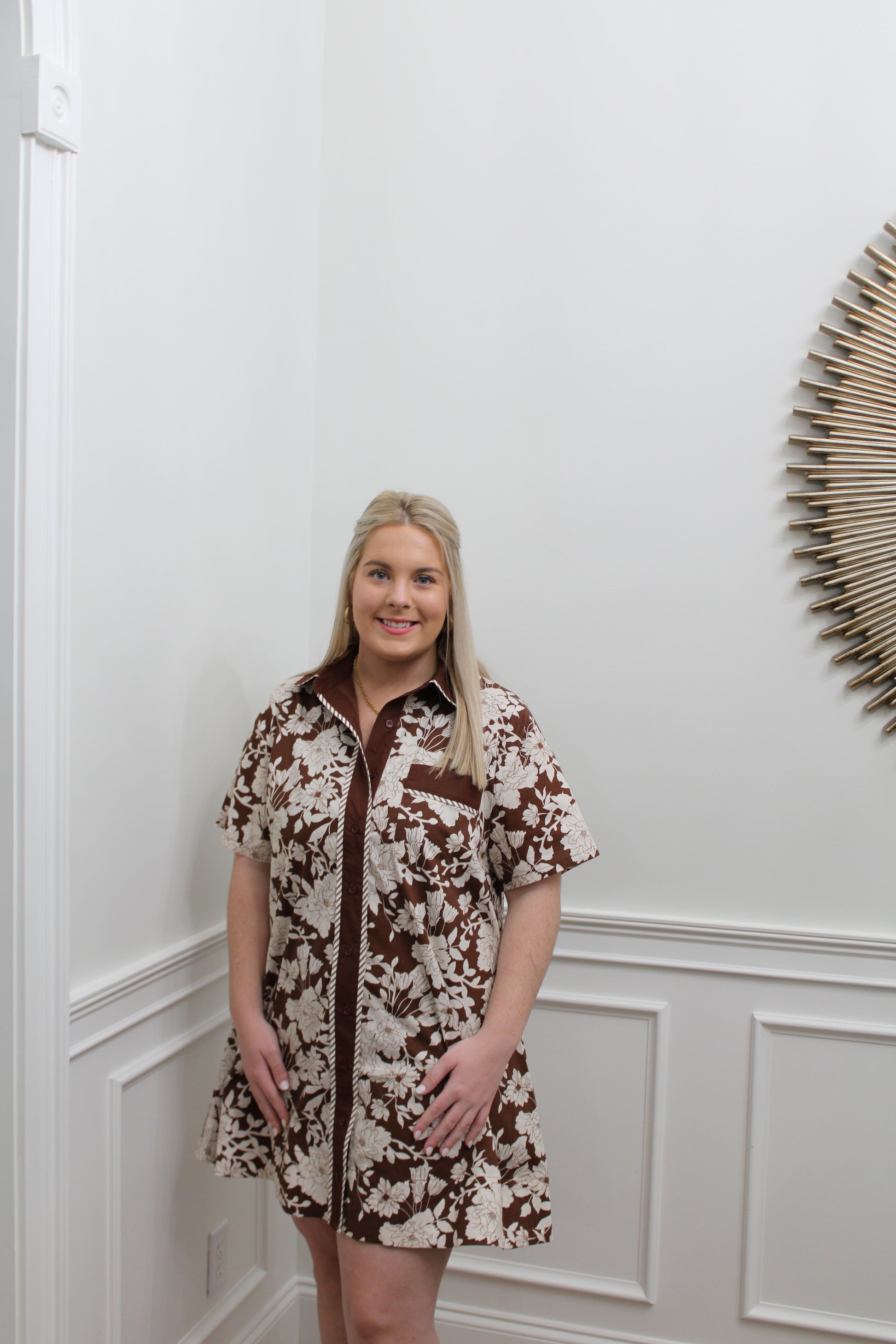 Timeless and effortlessly chic, The Brown Blossom Dress features a soft floral print on a warm cocoa background that’s made for every season. This collared button-down style offers a relaxed fit with a touch of structure — perfect for brunch dates, errands around town, or casual fall gatherings.